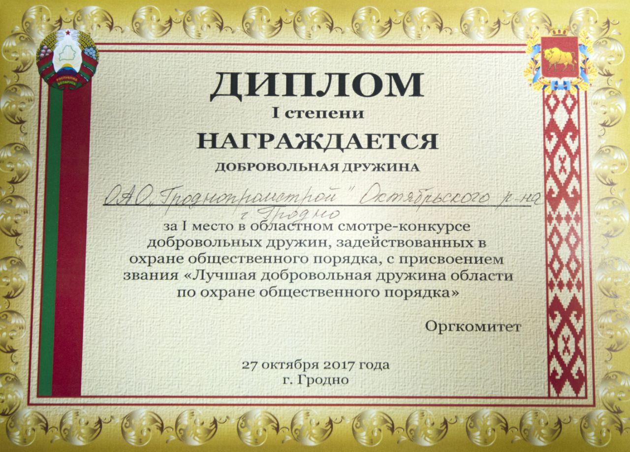 Команда добровольной дружины ОАО «Гроднопромстрой» из числа работников проектно-технического управления: Артухевича Е. В., Бандысика А. Н., Курачева В. В., Максимовича П. Д., Яскевича А. В. на областном смотре-конкурсе добровольных дружин, задействованных в охране общественного порядка, заняла 1 место из 20 команд-участников.
